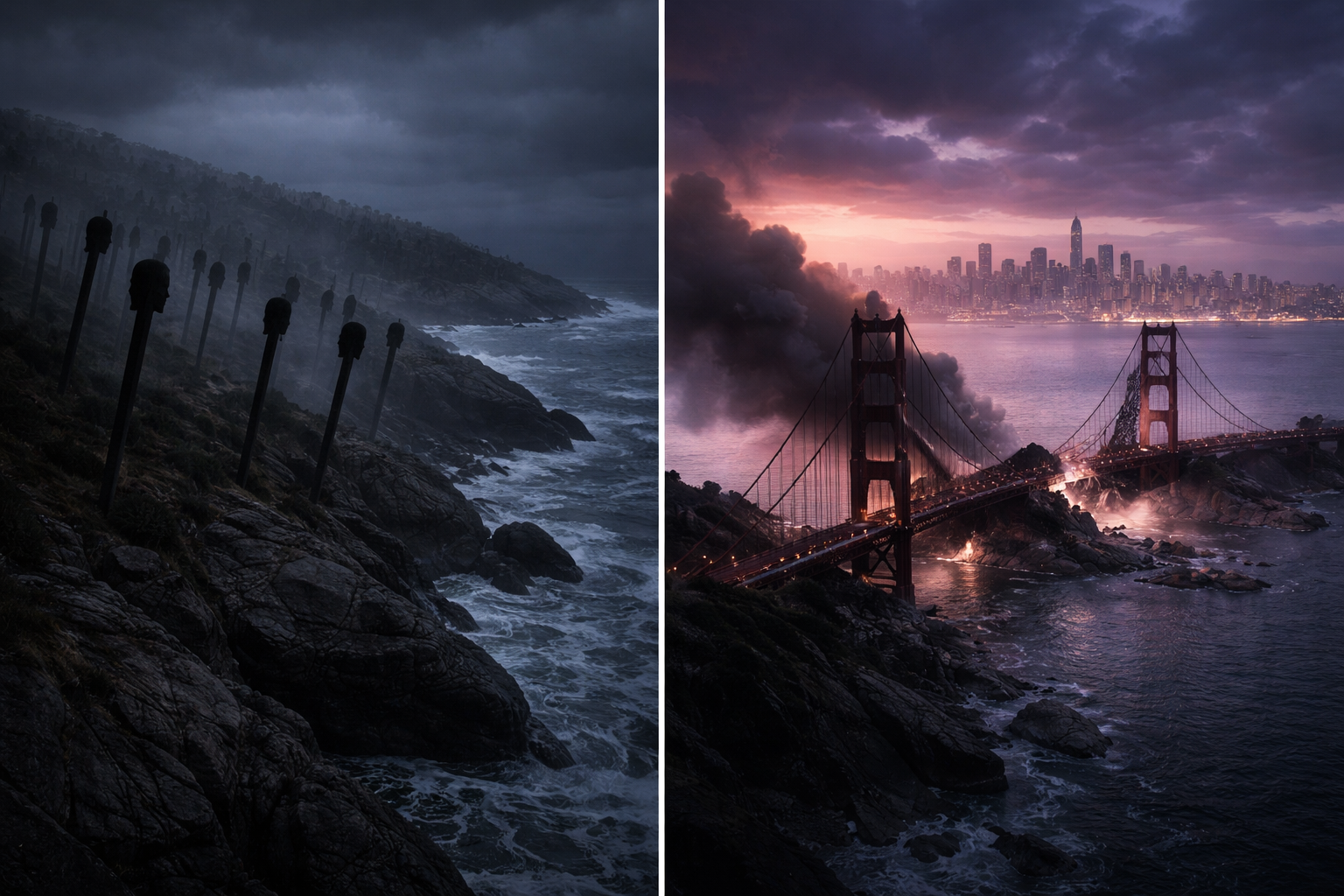 the golden gate bridge lies collapsed—its scaffolding shattered, its span undone. from its wake, a bloom of smoke unfurls into the night sky—the violence that birthed it already receding, leaving only residue behind..