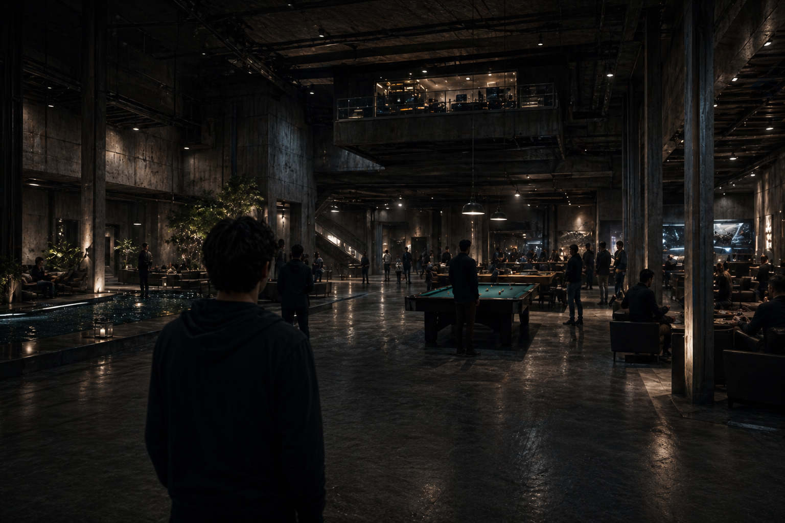 arriving, i find myself in a vast, dark, cement–reinforced hangar––cathedral–scale, subterranean––alongside high school and college friends. i drift through its advanced facilities, eventually opting to shower via extremely filtered water in a high–end spa, then lingering in adjoining recreation spaces—adorned with seemingly curated twenty–something women (as though vetted for aesthetic coherence), and other strangers familiar..
